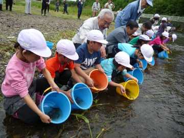 弟子屈小がヤマメの稚魚放流 「元気に育って」と願い込め 地元建設会社など協力